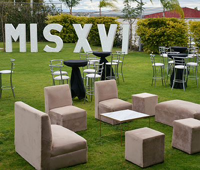 Carpas, pisos, mobiliario lounge, sillas, mesas, mantelería, loza, arreglos florales.